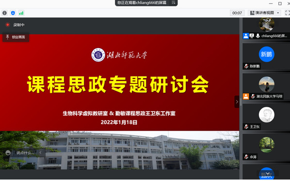 本网讯 为进一步深入推进课程思政建设,充分发挥课程思政教学名师团队圈层效应,交流推广课程思政建设的经验和做法, 1月18日上午,我校生物科学虚拟教研室与勤敏课程思政王卫东工作室通过云端举办了课程思政专题研讨会。会议由生命科学学院副院长陈亮主持,副校长余涛、教务处、学院相关负责人、思政骨干教师以及来自新疆师范大学、湖北民族大学等高校和黄石六中等中学共计100余名教师参加了会议。