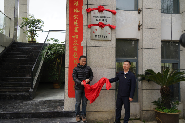 王磊首先对城市与环境学院领导的到访表示热烈欢迎。他表示,与湖北师范大学的科研合作,将为莲花湖生态修复带来新一轮宝贵契机和强有力技术支撑。会上,双方就各自基本情况、发展优势和需求进行了深入交流。双方一致认为,两者可在湖泊湿地修复与保育和人才培养等方面进行全面合作,实现优势互补、合作共赢。王湖坤与黄勇共同签订了科研合作、实习基地协议。会后,杨应华与王磊共同为“湖北师范大学湖北阳新莲花湖国家湿地公园科研基地”和“湖北师范大学实习实训基地”揭牌。