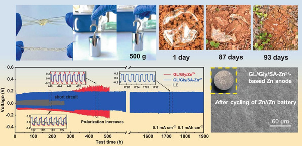 针对传统水凝胶电解质无法兼顾高机械强度、高离子迁移数与良好界面稳定性等挑战,该研究创新性地设计了一种全天然、可生物降解的双网络水凝胶电解质体系(GL/Gly/SA-Zn2+)。该体系由明胶(GL)和海藻酸钠(SA)两种生物质材料通过氢键和动态Zn2+配位键形成双交联网络结构,并引入甘油(Gly)作为多功能增塑剂。该结构不仅提供了0.9 MPa的拉伸强度和2.7 MPa的压缩强度,在同类水凝胶电解质中处于领先水平,同时其固定化的–COO-基团可选择性地引导Zn2+输运,促进锌的均匀沉积,有效抑制枝晶生长。结合DFT理论计算和实验表征,研究团队系统揭示了该水凝胶电解质在界面离子调控方面的微观机理。