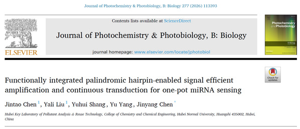 2月,Journal of Photochemistry & Photobiology B: Biology(《光化学与光生物学杂志B:生物学》)在线发表该团队研究成果,论文题为“Functionally integrated palindromic hairpin-enabled signal efficient amplification and continuous transduction for one-pot miRNA sensing”(功能集成型回文发夹介导的信号高效扩增与连续转导用于一体化miRNA检测)。该院2022级硕士研究生陈金涛和2024级硕士研究生刘雅利为论文共同第一作者,陈金阳副教授为论文通讯作者,湖北师范大学为论文唯一通讯单位。Journal of Photochemistry and Photobiology B: Biology是Elsevier出版社旗下生化与分子生物学领域知名期刊、中科院生物学大类2区期刊,最新影响因子为3.7。