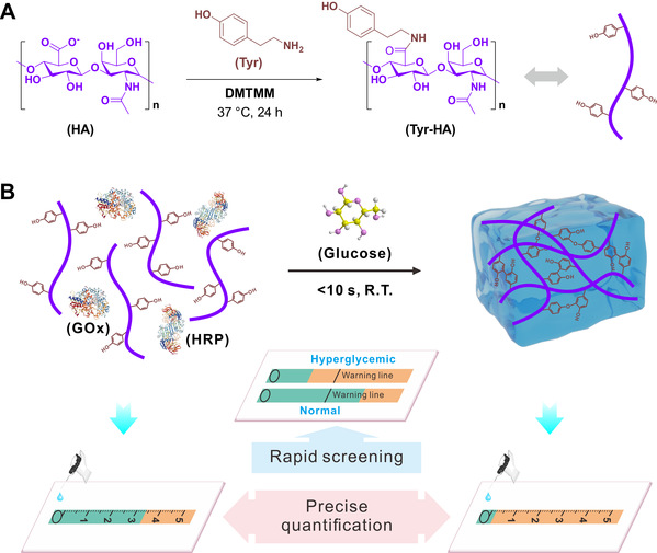 酪胺修饰透明质酸的合成及葡萄糖即时检测原理示意图
